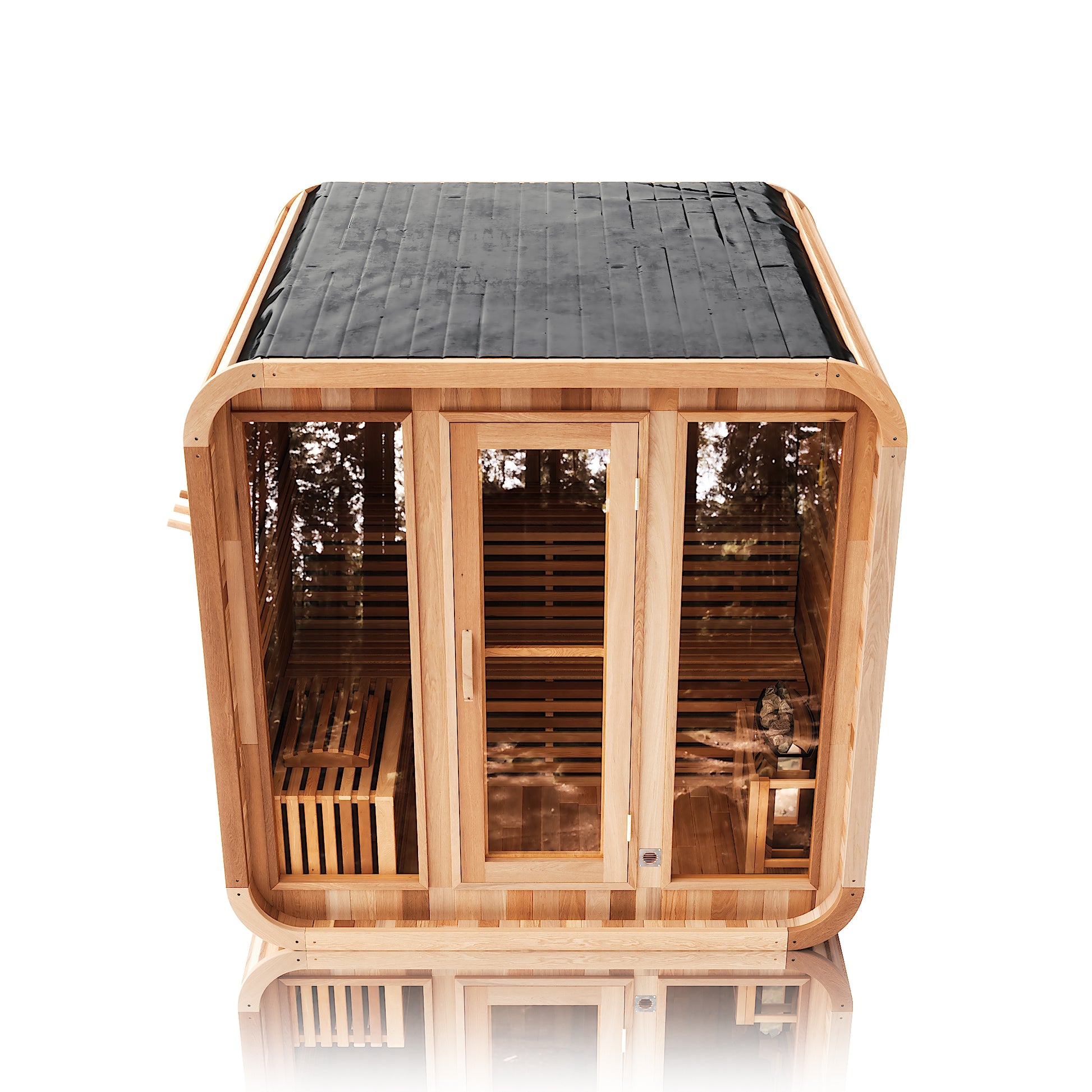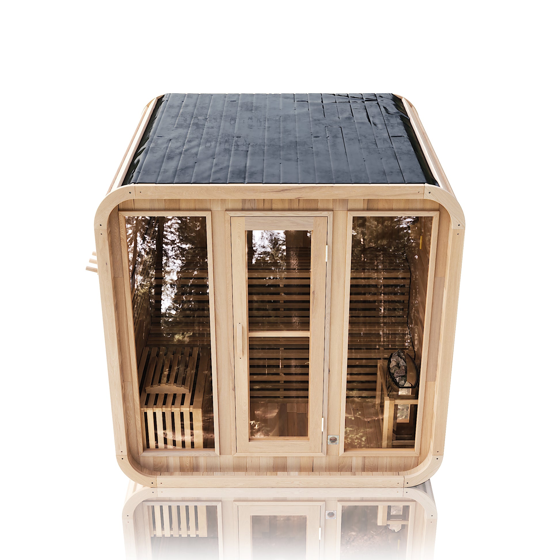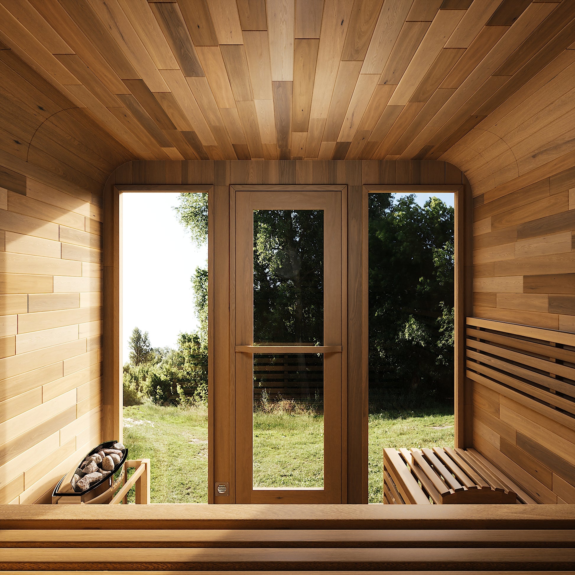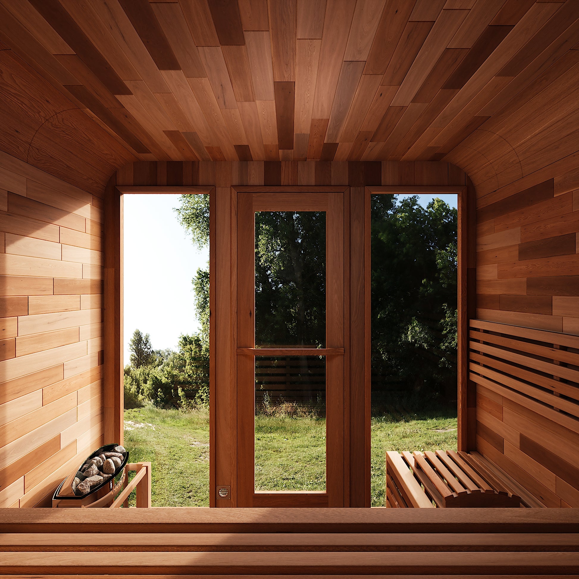 Each sauna comes with a Harvia SW60 stove, volcanic stones, wooden barrel and spoon, sandglass, thermo-hygrometer, and explosion-proof light.