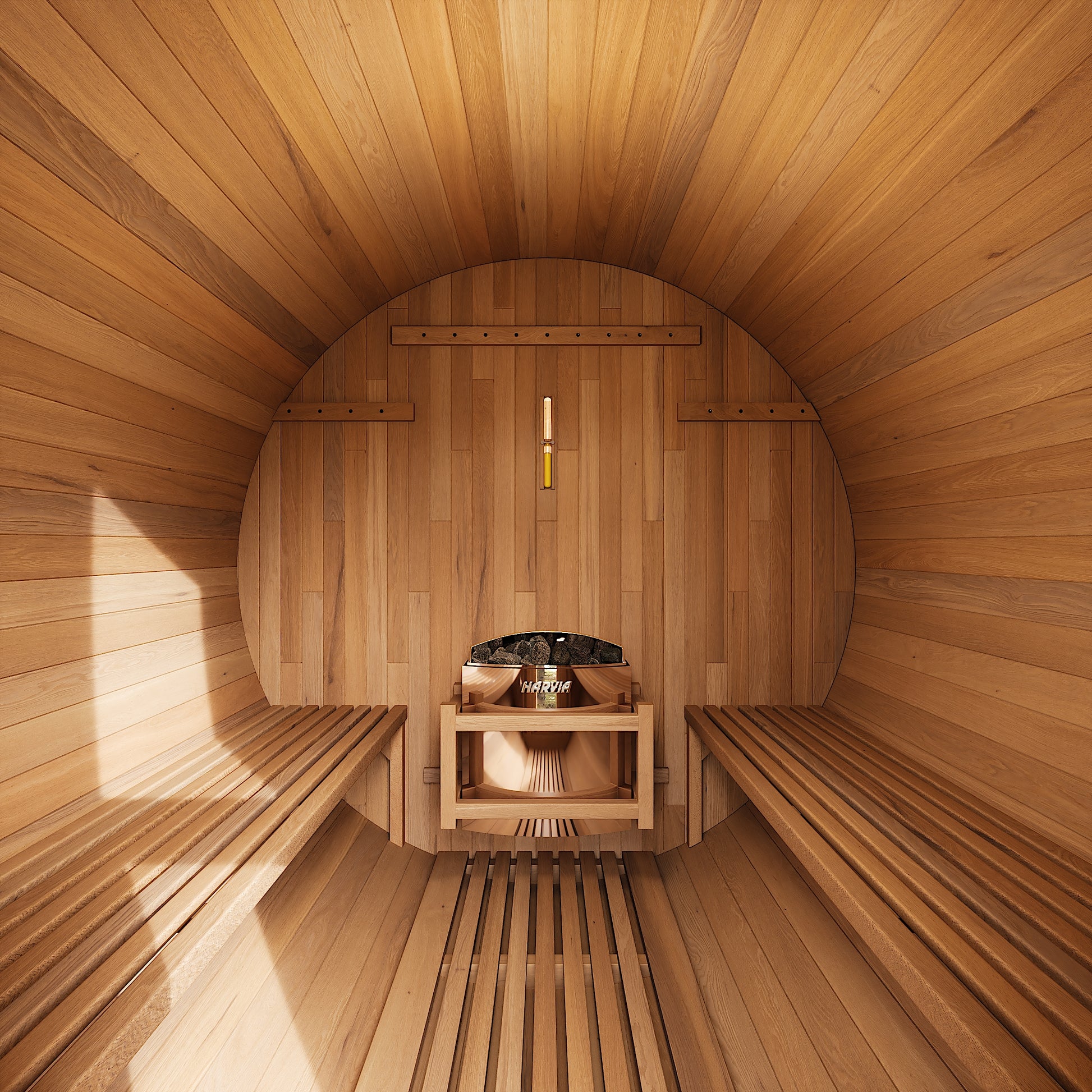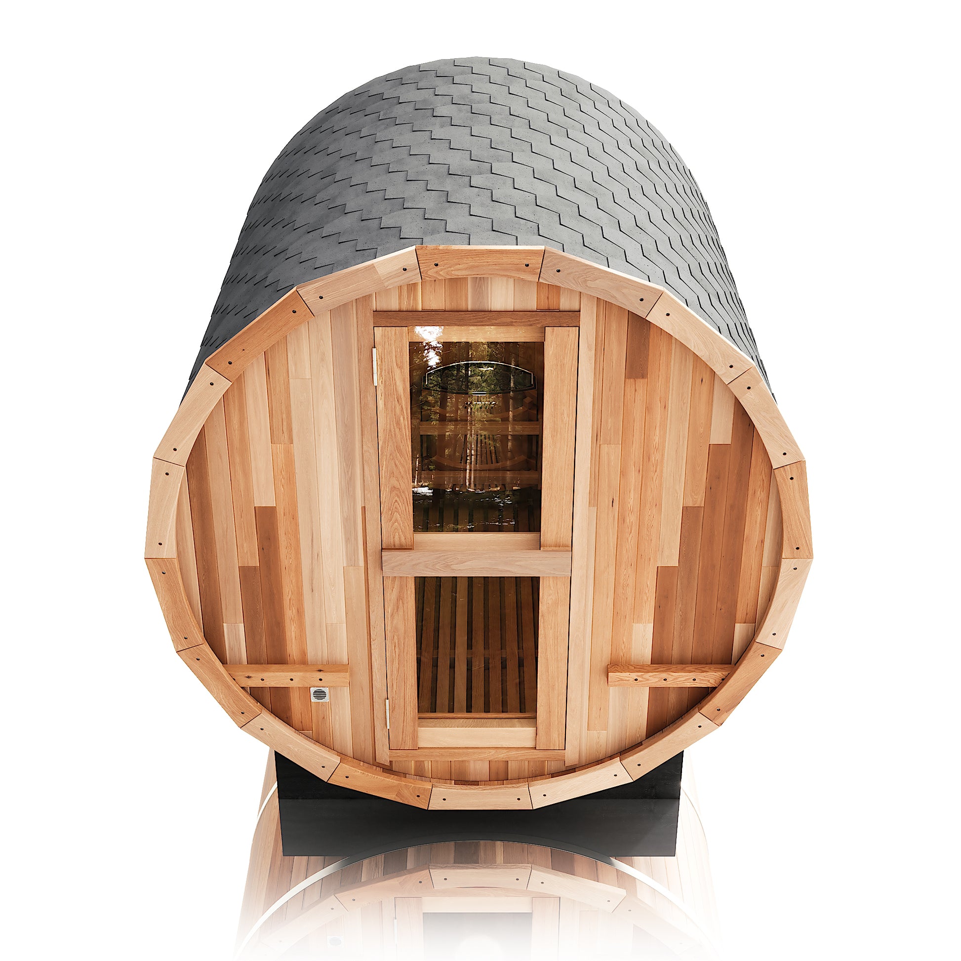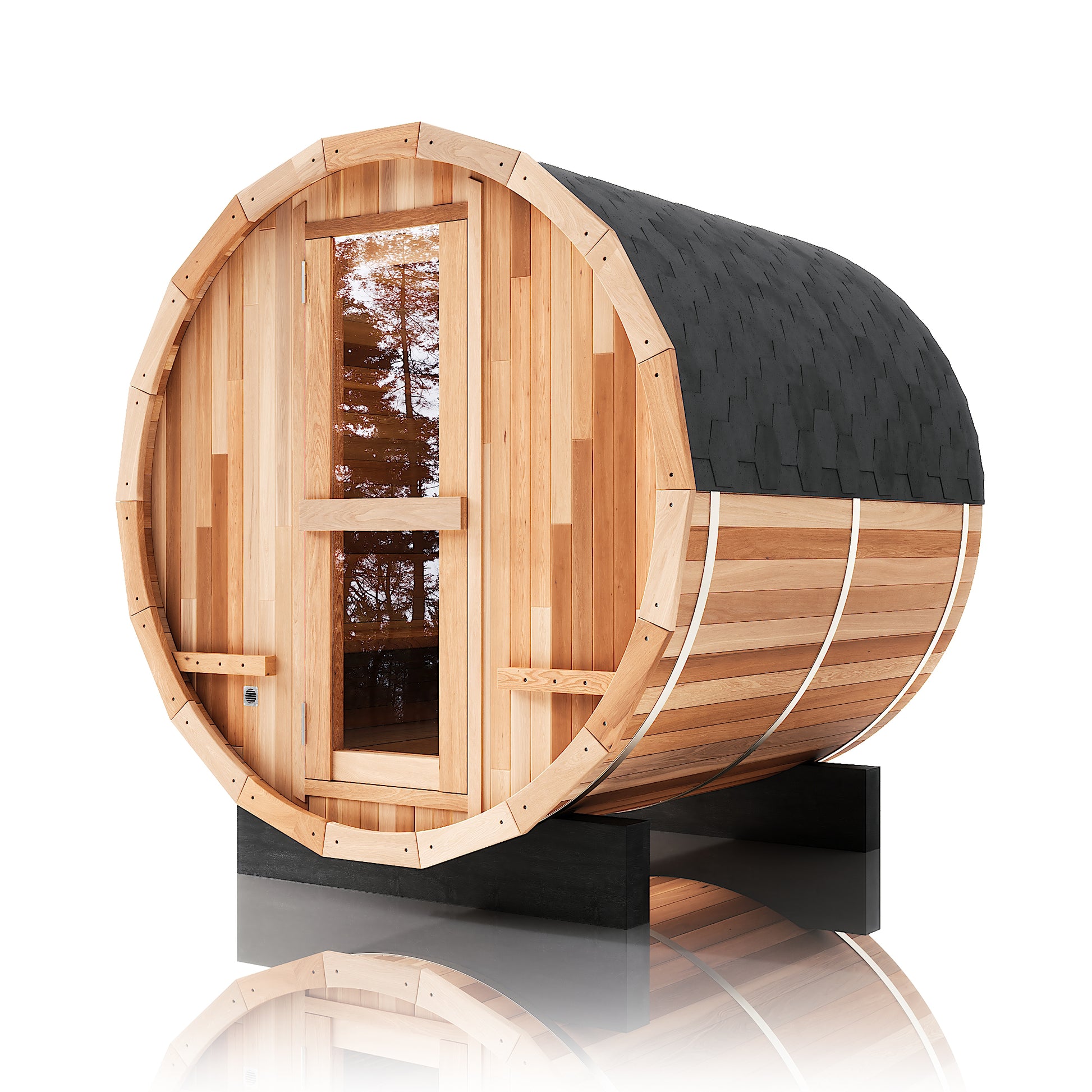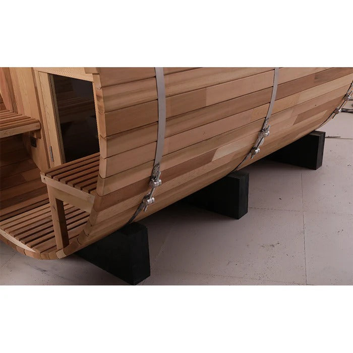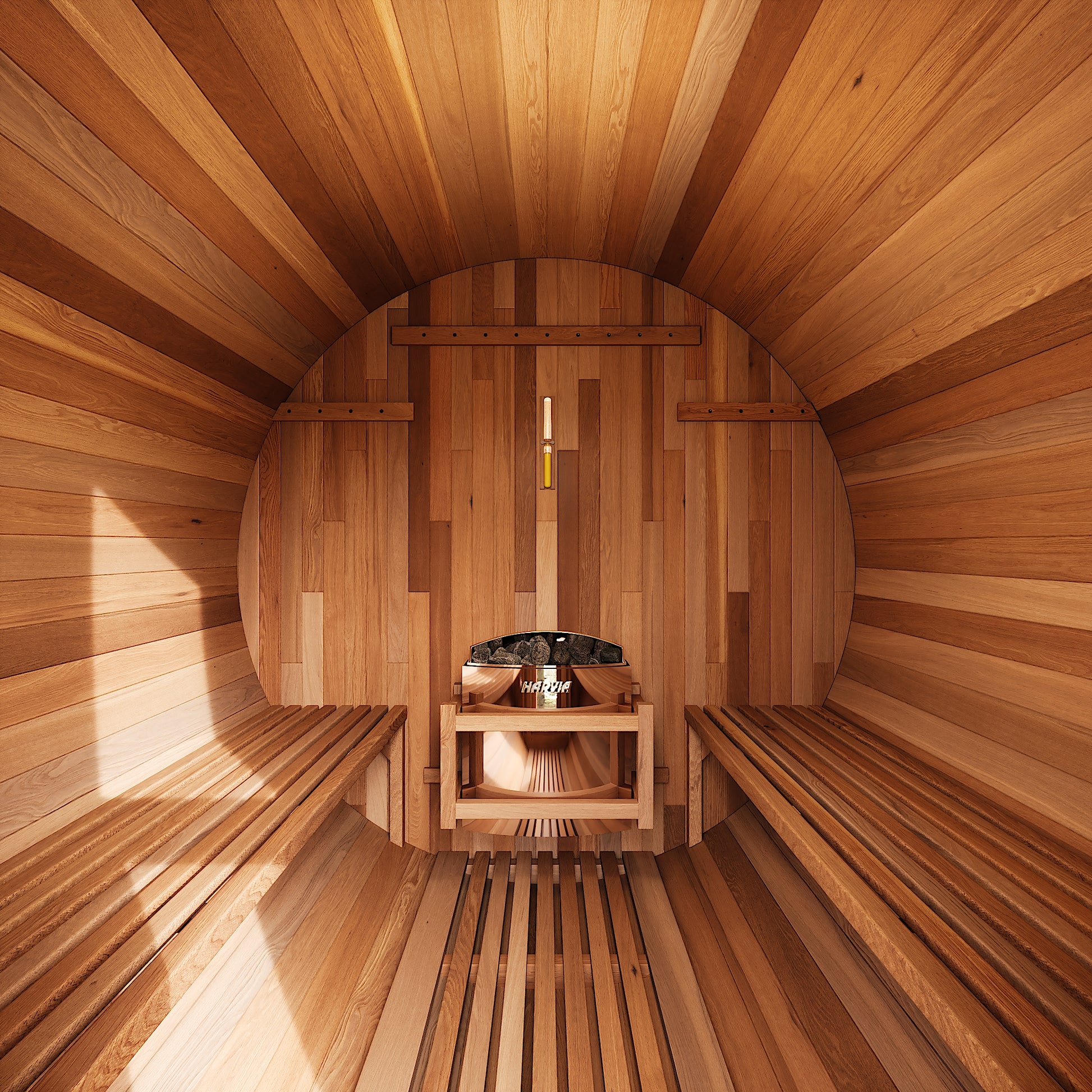 The Renegade is a rugged yet refined 4–6 person barrel sauna crafted from premium Hemlock or Red Cedar. Built for those who want big performance in a smaller footprint, it’s a compact barrel that packs a serious punch—powered by a 6 kW Harvia heater, volcanic steam stones, and two long reclining benches for a full-spectrum, deeply restorative sauna session.