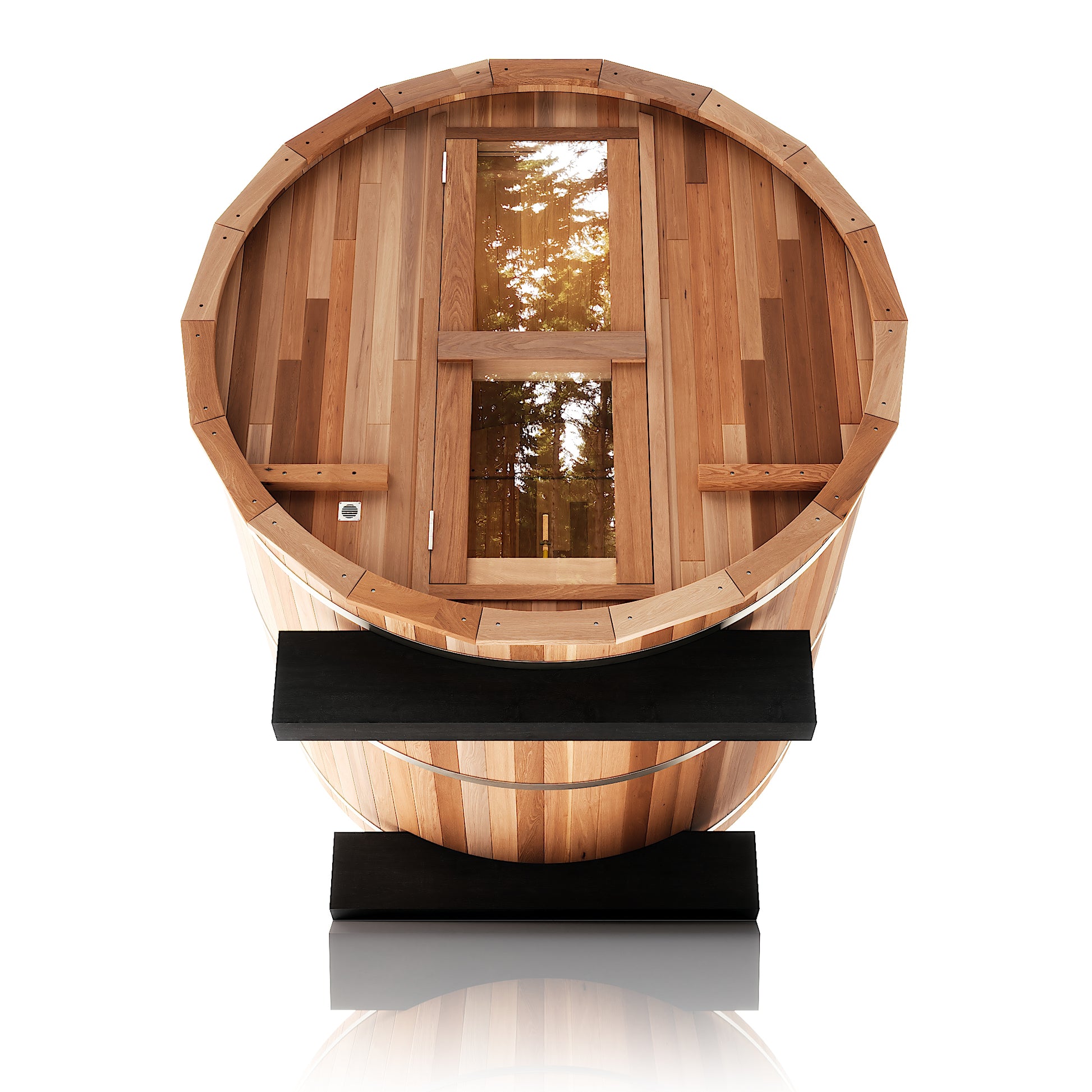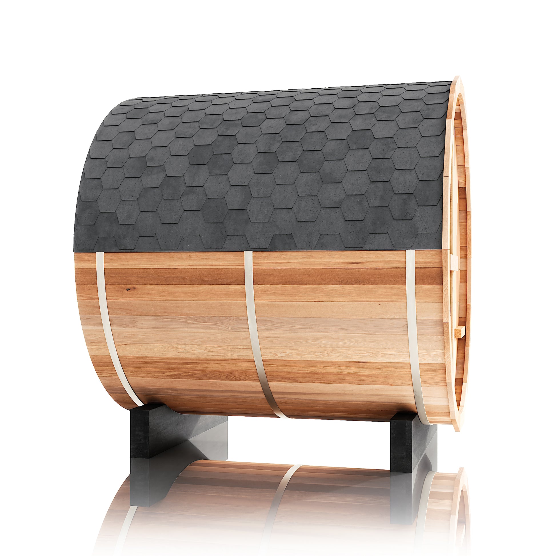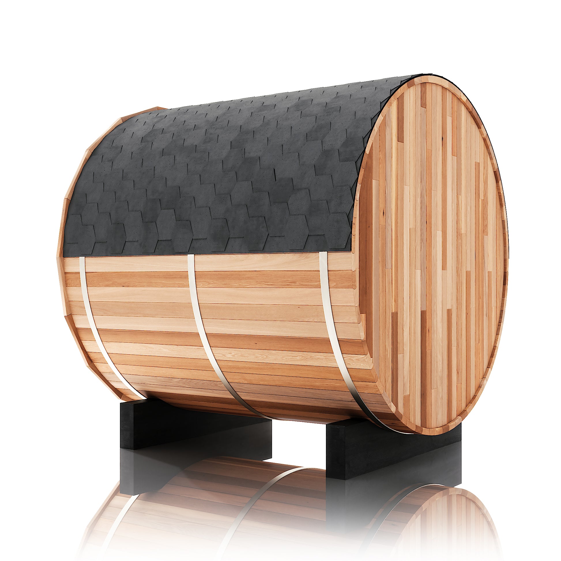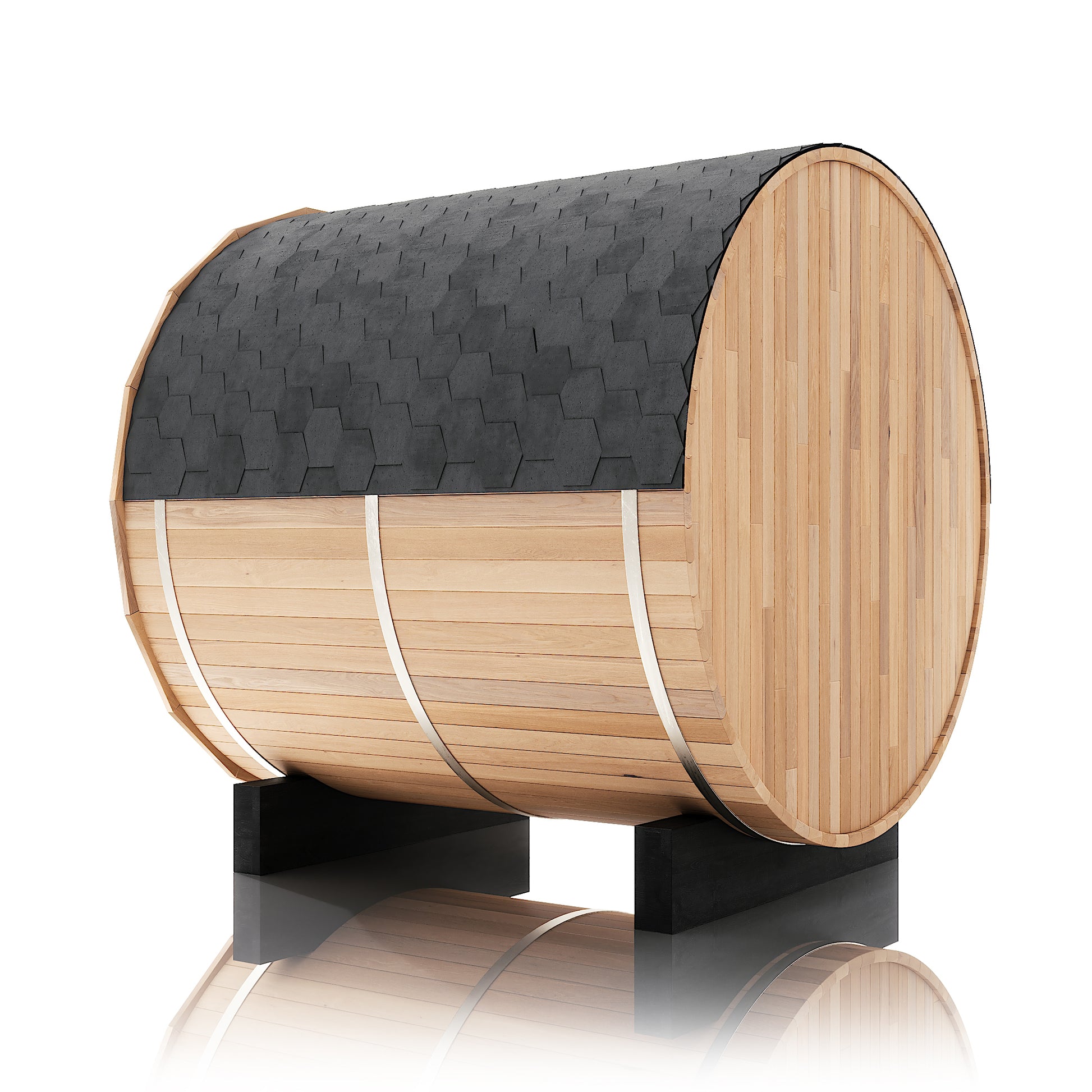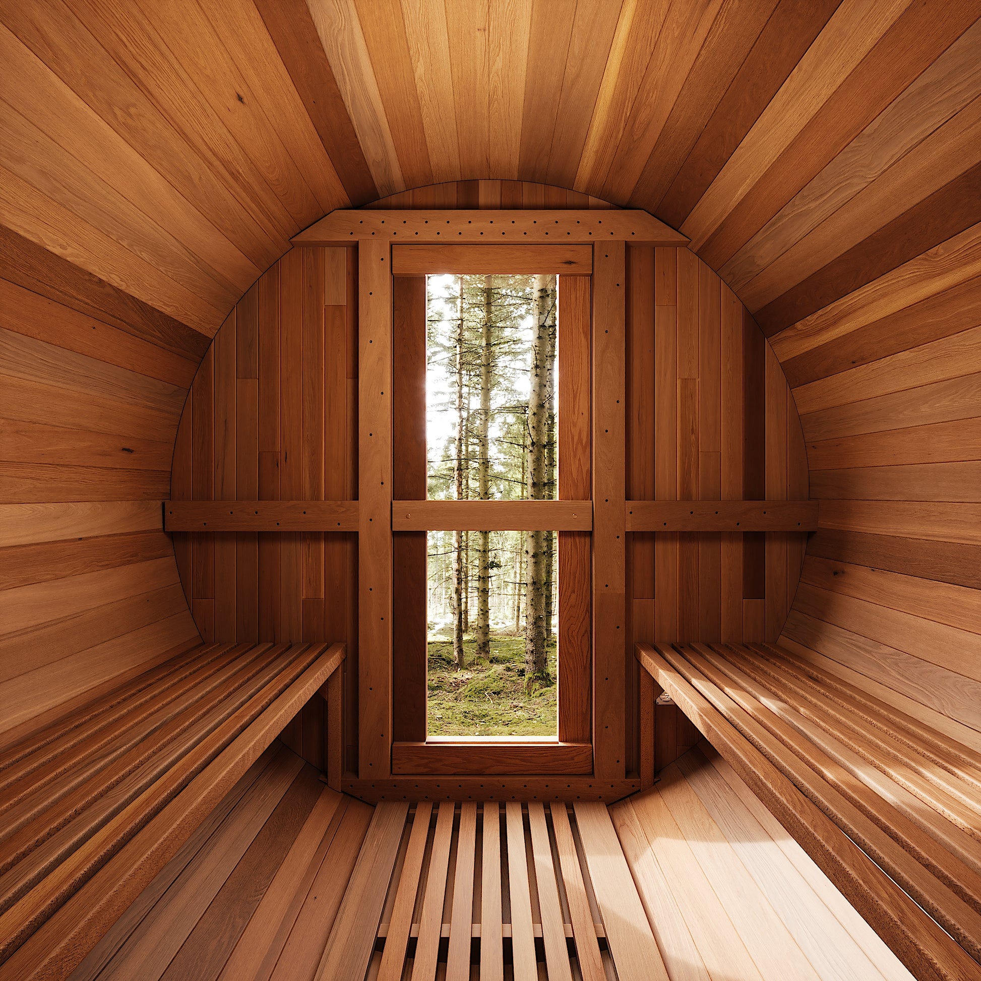 The Renegade is a rugged yet refined 4–6 person barrel sauna crafted from premium Hemlock or Red Cedar. Built for those who want big performance in a smaller footprint, it’s a compact barrel that packs a serious punch—powered by a 6 kW Harvia heater, volcanic steam stones, and two long reclining benches for a full-spectrum, deeply restorative sauna session.