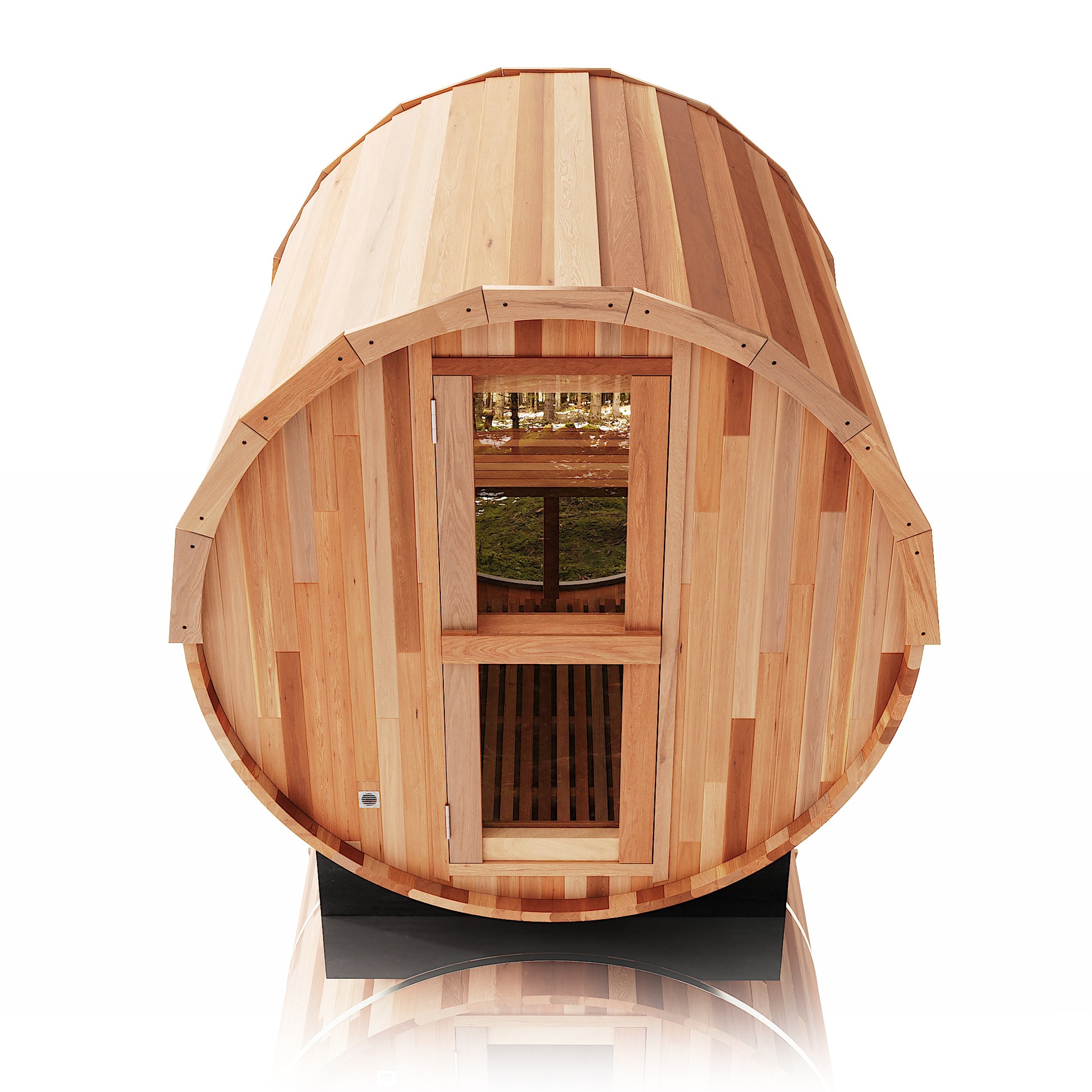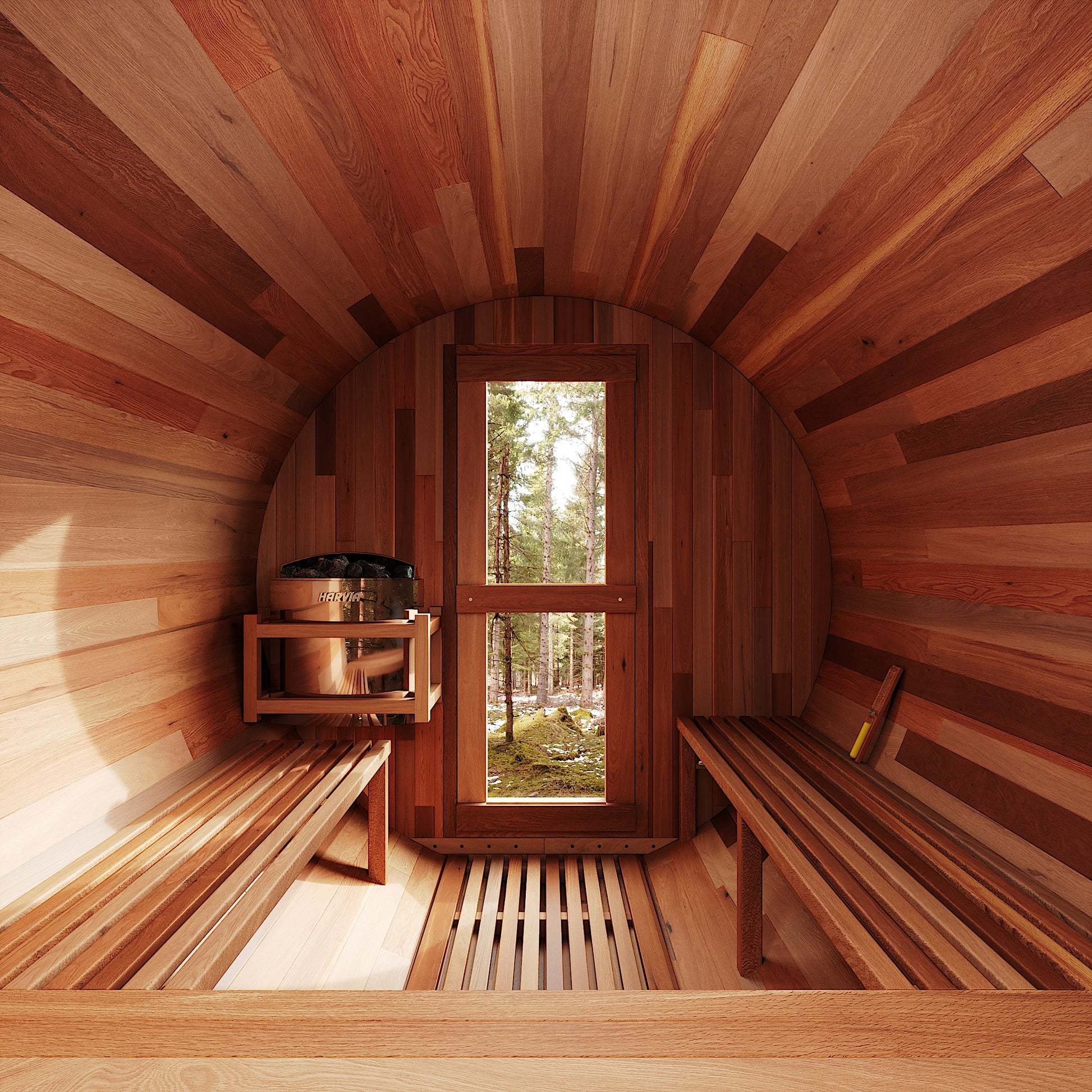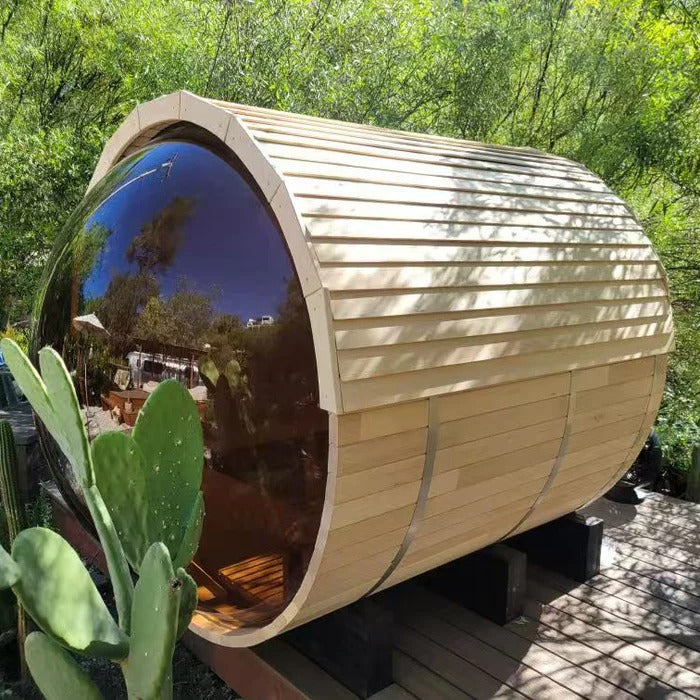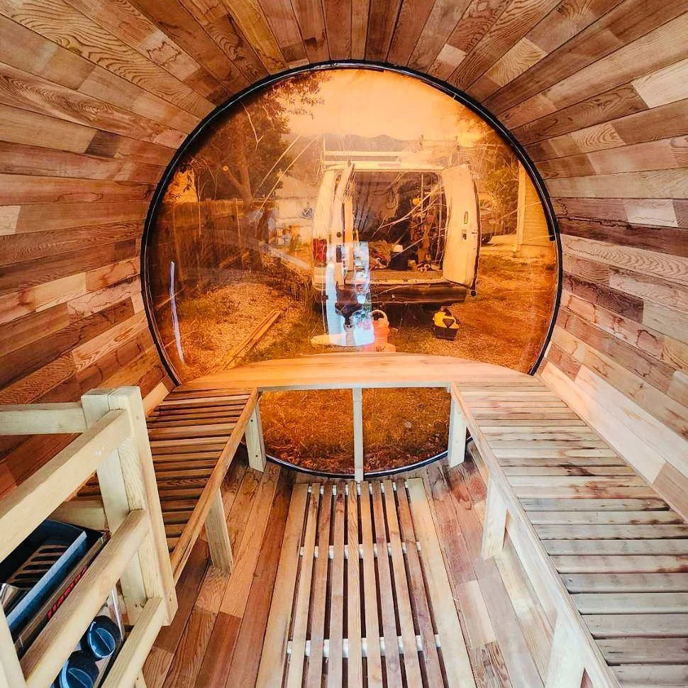 The Trailblazer sauna is designed for 4–6 people and is available in premium Hemlock or Red Cedar wood, offering natural durability, excellent insulation, and resistance to warping, with Red Cedar adding rich aroma and enhanced moisture protection; it is powered by a Harvia SW60 electric heater delivering 6.0 kW of heat on 220V / 240V with a 30A current, and provides a temperature range of 0–195°F for consistent sauna sessions. Each unit includes a complete accessory set with a wooden bucket and spoon, anti-crack volcanic stones for steam generation, a sandglass timer, a thermo-hygrometer, and explosion-proof lighting, while construction highlights include a waterproof asphalt-tiled roof with sealed joints to prevent leaks, a heat-resistant wooden door handle, a breathable vent hole for fresh airflow, high-temperature explosion-proof lighting, and an 18-inch-wide bench designed for comfortable reclining or lying down.